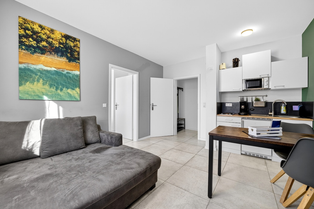 Ein kleines gemütliches Appartement.Zentral, aber ruhig in der Natur gelegen. Das Apartment bietet alles für einen kurzen oder längeren Aufenthalt. Es verfügt über einen schönen Schlafbereich, voll ausgestattete Küche, sowie einen gemütlichen Wohnbereich mit TV und Schreibtisch.Zu dem läd eine kleiner gemütlicher Platz auf der Terrasse zum Verweilen ein.Unser Schwimmteich bietet reichlich Abwechslung. Kostenloser Parkplatz direkt vor der Tür. Fahrräder können im Hof parken.
