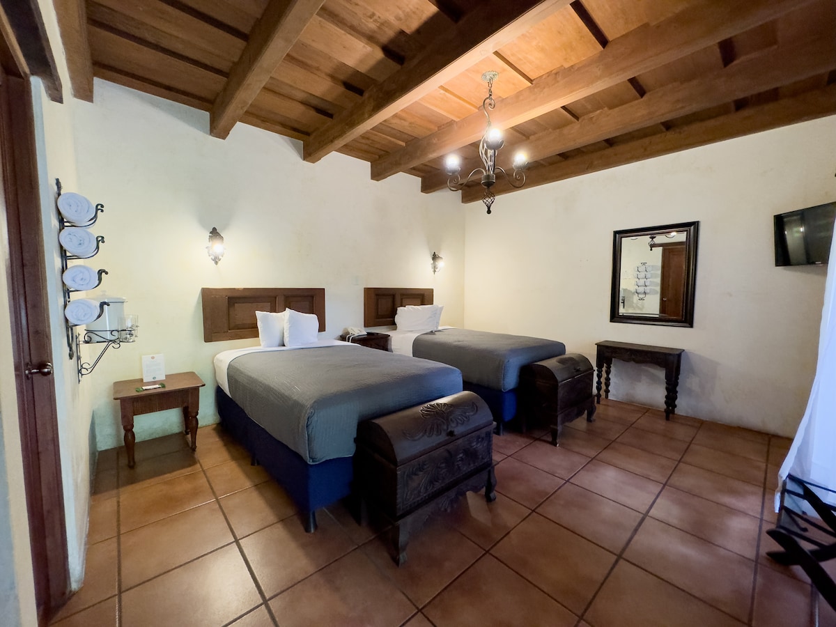 Acogedora y funcional, esta habitación es perfecta para quienes buscan un espacio cómodo y bien ubicado para descansar después de explorar Antigua. Cuenta con dos camas matrimoniales, baño privado, ventiladores, TV con cable, caja de seguridad y amenidades esenciales. Aunque su tamaño es compacto, está cuidadosamente equipada para brindarte una estancia tranquila y sin complicaciones. Ideal para viajeros solos o en pareja que valoran la comodidad, el servicio cercano y el ambiente colonial.
