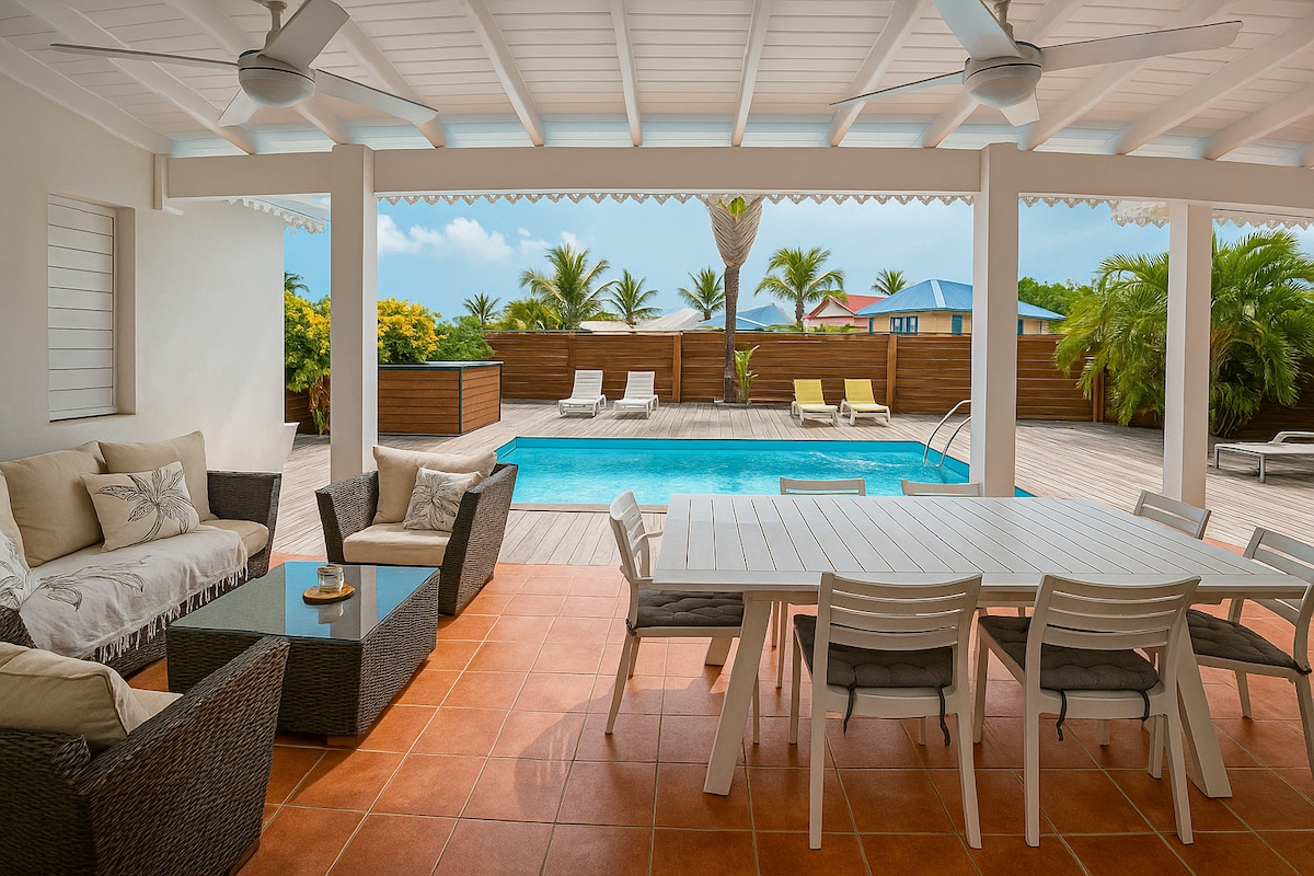 Located in Terres Basses, near Baie Rouge beach, and with a magnificent view of the ocean, you will find a fully private 2 bedrooms, 2 bathrooms villa, ideal place for a family, couples or friends. With a large covered terrace, a pretty salt water swimming pool in the middle of a deck, all in the heart of a tropical garden, where you will definitely enjoy the wonderful ocean view that will allow you to relax.