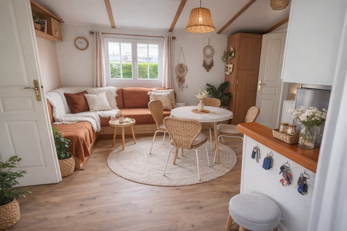 MOBIL-HOME confortable & cosy 40m2 au calme, VUE DEGAGEE devant et derrière CONTROLE ASSURE entre 2 locations, draps et serviettes jetables fournis LOCATION linge tissus SEJOUR CENTRAL , parties nuits aux extrémités 3 CHAMBRES, 1 lit double & 4 lits simples, 2 Salles d'eau & 2 WC CHAUFFAGE dans toutes les pièces, double vitrage, stores occultants et moustiquaires dans les chambres TERRASSE COUVERTE, parking privé ARRIVEE de 14 à 21 H et départ 11H