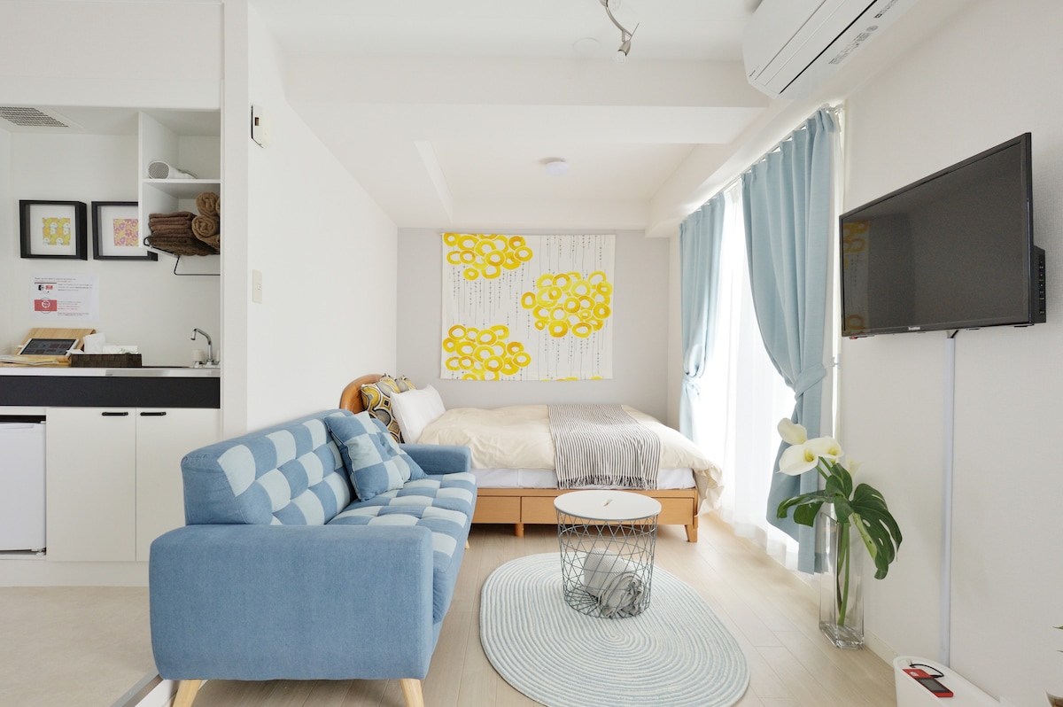 这是一间由室内设计师从零打造的 1LDK、41㎡ 公寓型民宿。 同一栋大楼内设有多间独立客房。 步行 7 分钟即可到达南海电铁与大阪地铁的天下茶屋站,从那里乘坐南海电车 2 站(约 5 分钟)即可到达难波站,无需换乘即可 35 分钟直达关西机场。 大阪地铁堺筋线还可直达京都、通天阁、黑门市场等主要观光景点。 天下茶屋是一座保留昭和时代风貌、又不断涌现新餐厅与商店的热门街区,兼具怀旧与活力。 ◆ 房源特色 安静、安全的住宅区 直达难波、关西机场、通天阁、黑门市场、京都(阪急线),无需换乘 步行 2 分钟范围内有便利店与超市 车站前设有购物中心 厨具齐全,可自行烹饪 整间独享,完全私密 自助入住系统,轻松无压力 免费洗衣机(附赠洗衣液) 洗漱用品齐全(洗发水、护发素、沐浴露、浴巾、拖鞋、牙刷、化妆棉、棉签、剃须刀) 可用日语、英语跟中文沟通 提供高速 Wi-Fi