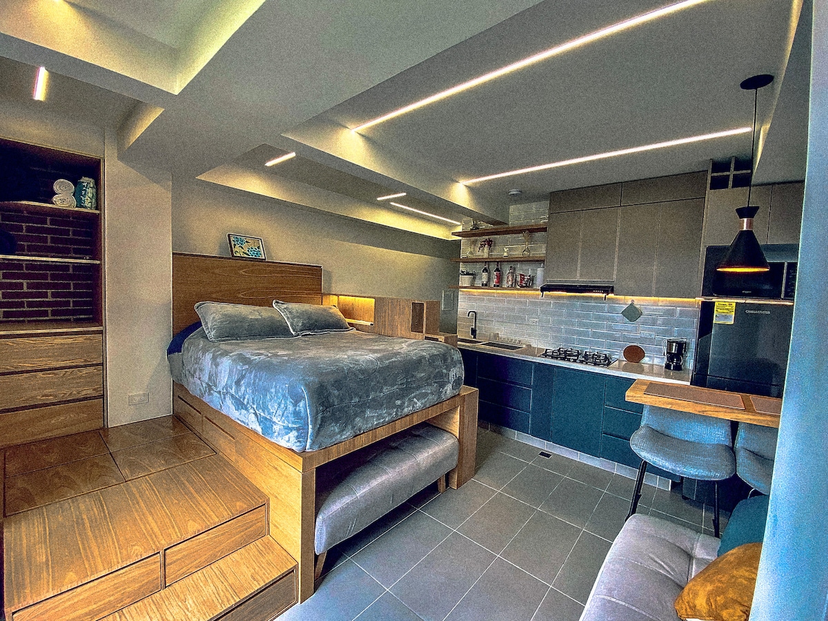 Our comfortable one bedroom apart-studio, interior location with windows towards a garage, and to a courtyard, bohemian, minimalist, with a small garden has a true city feeling! It comfortably accommodates four people and it´s centrally located on a street, with easy access to Simon Bolivar Metropolitan Park. Enjoy a complete kitchen, and access to Transmilenio. This space is ideal for two people; however, we provide a high quality sofa bed for two more people should the need arise. Hot water