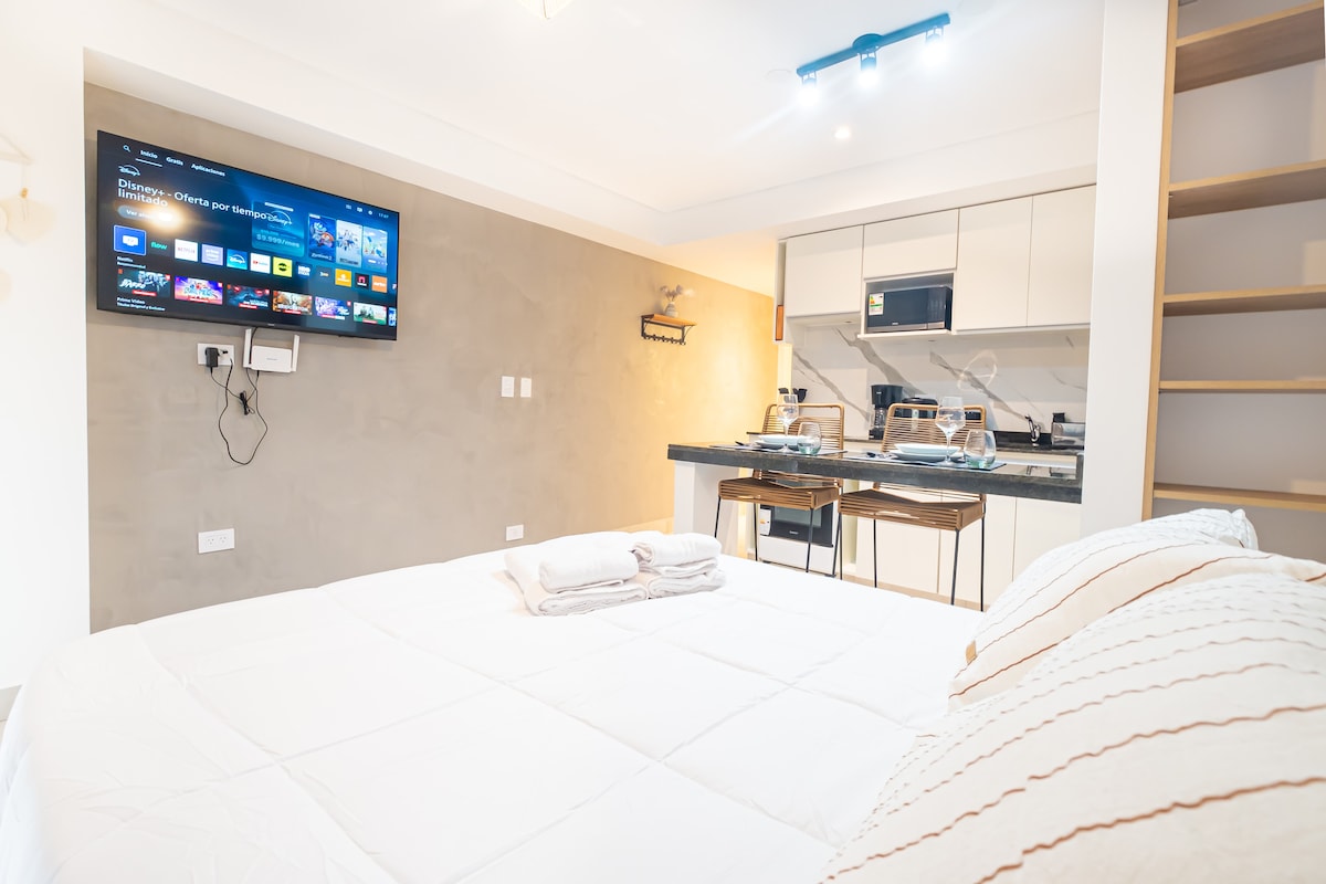 Monoambiente moderno y totalmente equipado, ideal para disfrutar Salta con comodidad. Cuenta con cama confortable, smart TV, aire acondicionado, wifi rápido y cocina completa. El edificio ofrece pileta, SUM y asador para relajarse y disfrutar. Ubicado en una zona estratégica, con fácil acceso al centro, restaurantes y puntos turísticos. Perfecto para viajes de placer, pareja o trabajo, combinando confort, ubicación y estilo.