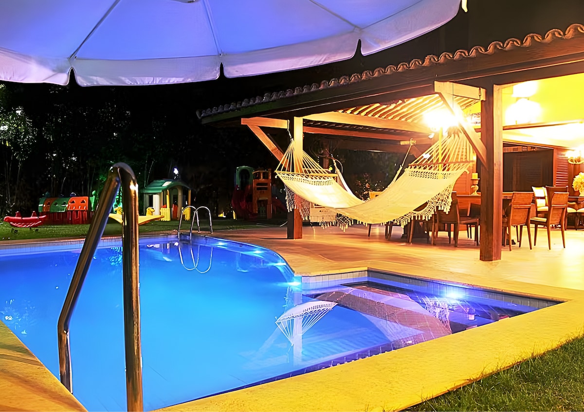 Desfrute do melhor de Jacuípe nesta casa de alto padrão, a 250 m do encontro do rio com o mar. Com 8 suítes , sendo 7 delas climatizadas, acomoda até 18 adultos + 4 crianças em 952m² de conforto, área de lazer inclui piscina com cascata e churrasqueira, ideal para momentos inesquecíveis com família ou amigos. Próxima ao melhor banho de mar da Linha Verde, é perfeita para quem busca privacidade, tranquilidade e contato com a natureza. Reserve agora e viva essa experiência única