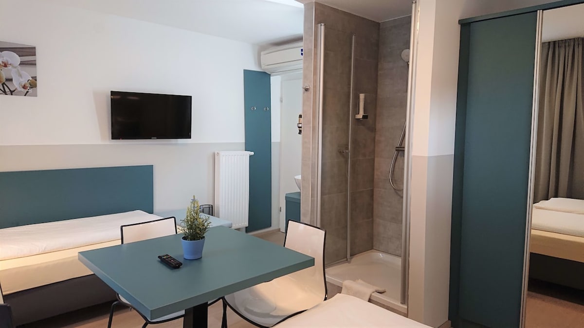 1 Raum Apartment für 1 bis 2 Personen! Badezimmer mit Dusche und WC separat mit Fenster! Küche voll ausgestattet mit Eß/Arbeitsplatz! In sehr zentraler Lage und Parkplatz nach Verfügbarkeit gratis vor dem Haus! Wlan gratis! Rauchen auf dem Balkon, kein Problem! Kontaktloser check in rund um die Uhr, nach bestätigter Buchung möglich! Gemütlich und komfortable knapp 40qm zur alleinigen Nutzung! Keine touristische Vermietung!