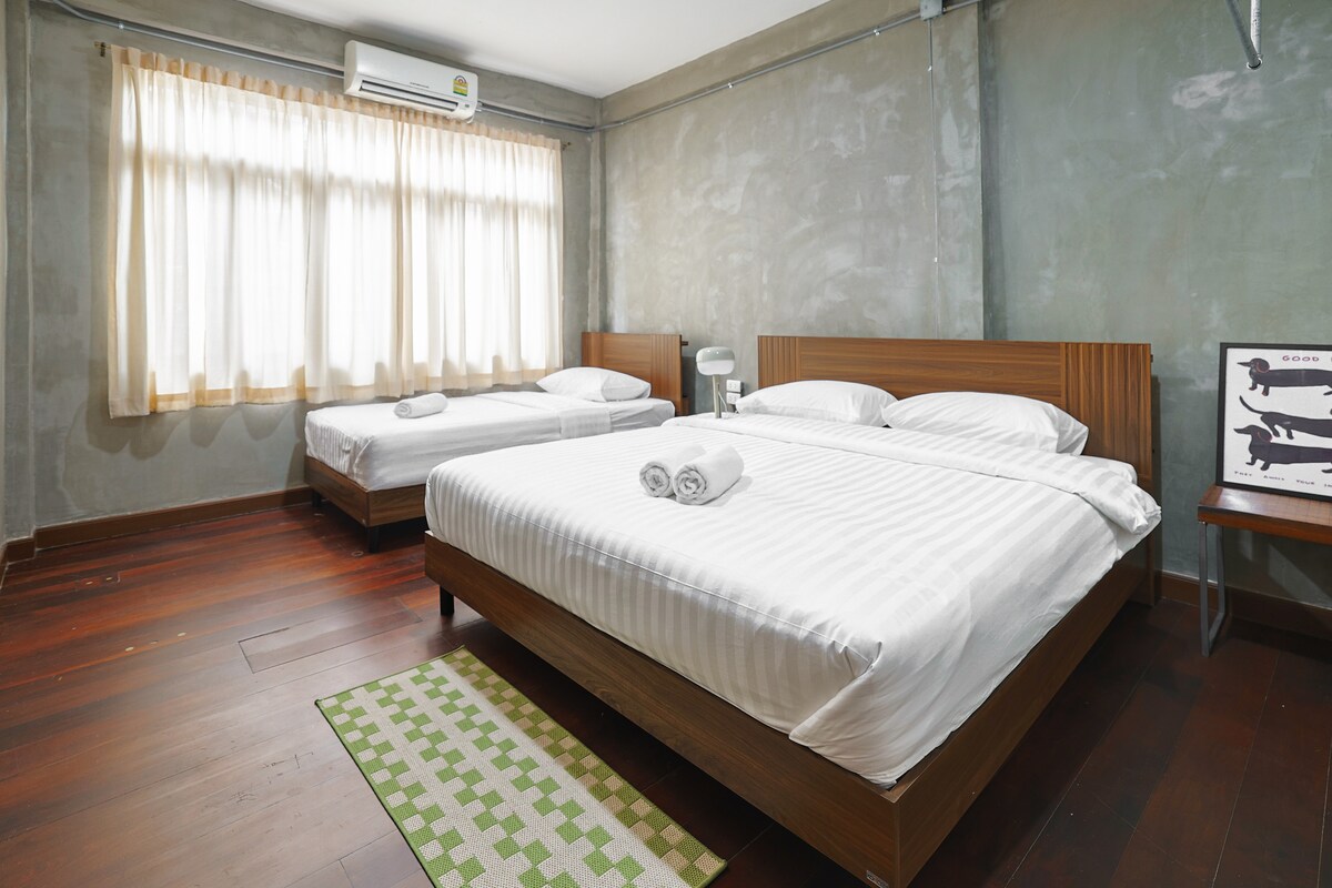 Enjoy a bright triple room with stunning city views, featuring a private external bathroom just for your group. Perfect for families or friends. Located at 72-74 Soi Charoen Krung 67,our place puts you near local street food, cafes, and convenient public transport. Relax with fresh linens, fast WiFi, and all essentials provided. Experience comfort and privacy while exploring the heart of Bangkok!
