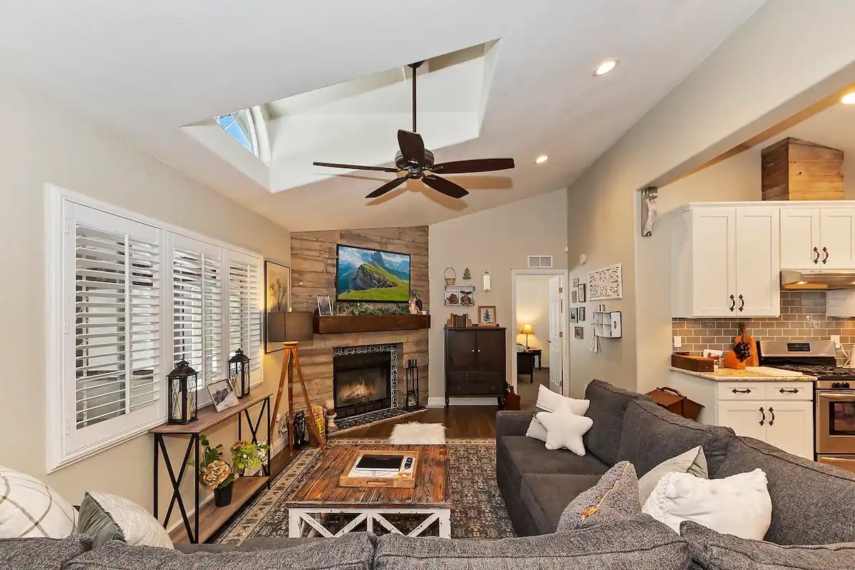 "Two Wolves" is perched in the evergreens w/treetop views. Perfect for gatherings yet it retains an intimate coziness for smaller groups. 30 min to Snow Summit (skiing), very close to Arrowhead Village, Skypark, Lake Gregory, hiking & more. 3 fl, 3 bdrm (4 bed), 2.5 bath has 3 working fireplaces, one decorative and 5 furnished decks & windows throughout so you can experience the natural beauty directly or from inside by the fire. Wifi, EV charging, smart lock for self-check-in, full kitchen.