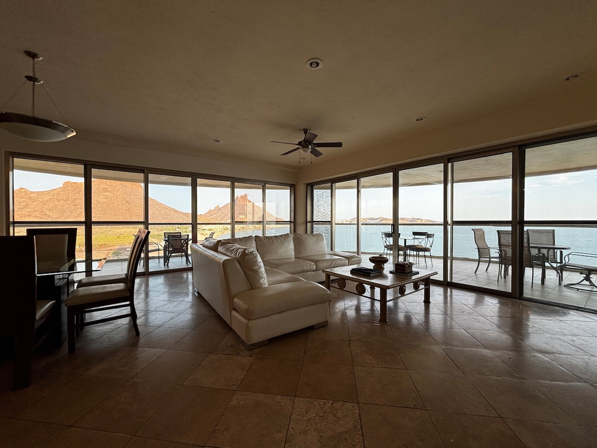Hermoso Condominio totalmente equipado y decorado de una recámara con cama king y una cama individual plegable , dos baños completos, aire acondicionado central, cocina totalmente amueblada, wifi gratuito, a la orilla de la playa, alberca , Jacuzzi , chapoteadero, ubicado en el piso 4 con una hermosa vista al mar en el pueblo mágico de San Carlos, Sonora, México NOTA IMPORTANTE SOLO ENTRE SEMANA SE RENTA UNA SOLA NOCHE MÍNIMO, EN FIN DE SEMANA , SON DOS NOCHES MÍNIMO