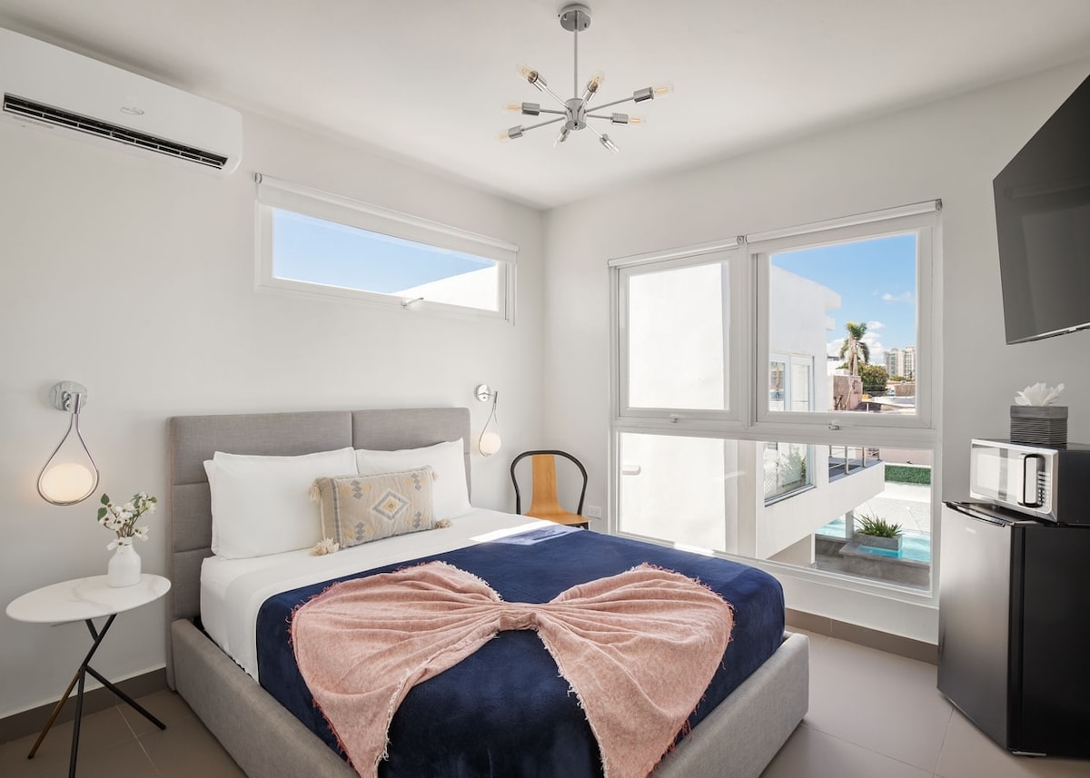 Rosalina Ocean Park is a bright, modern boutique hotel in the heart of Ocean Park, San Juan. With 19 unique units, two shared pools, and a peaceful courtyard, it's the perfect place to unwind after a day of sun and culture. Just minutes from Ocean Park Beach, Calle Loiza, and Condado. Whether you're here to relax, explore, or both, you’ll feel right at home. 🛎️ Please read the full description before booking.