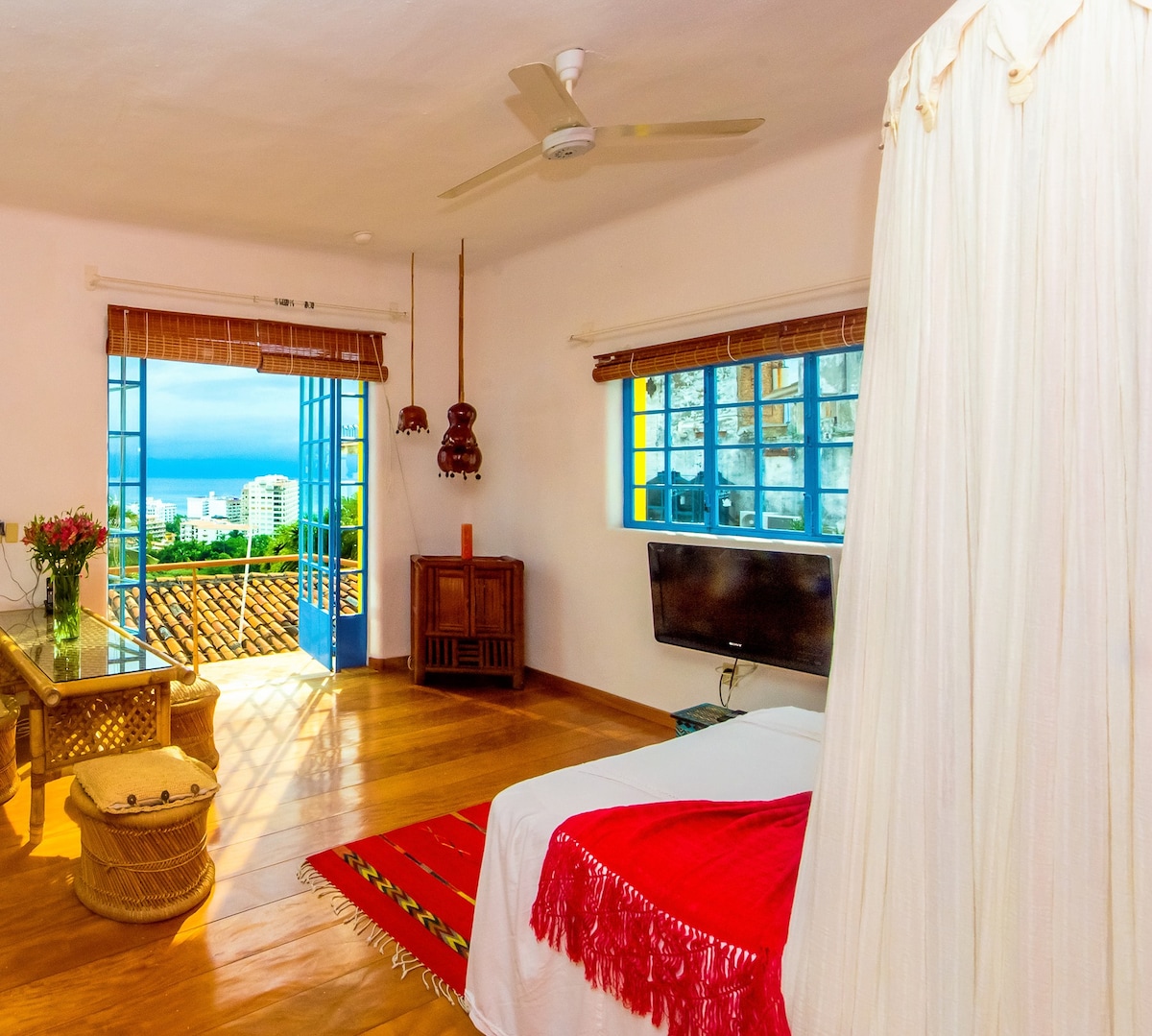 Exclusiva habitación con vista al océano, sobre un árbol. Ha sido bellamente decorada con un estilo único en tonos frescos y brillantes; de colores sólidos, ambientación mediterránea y con toques de la artesanía tradicional de México y otras latitudes. Una experiencia muy diferente.