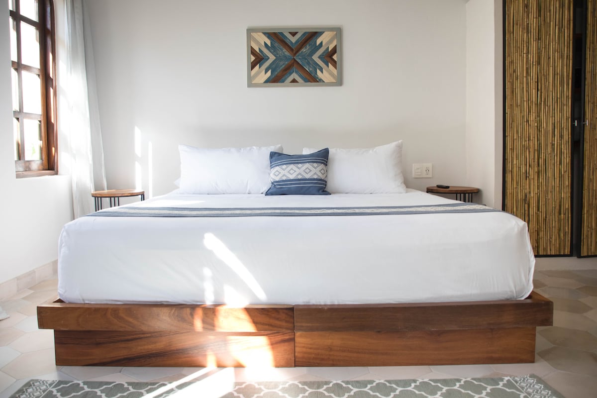 Our beautiful and spacious Suite 1 comes with a gorgeous sea view that will blow you away. It is located within a stunning property in the best area of Sayulita. This suite is a loft with two floors. The upstairs bedroom doesn’t have a wall or door separating it from the downstairs bedroom. First floor: Queen size bed, Mexican artists original pieces, kitchenette and a bathroom. Second floor: King size bed surrounded by 6 windows that brings the ocean right into the room.