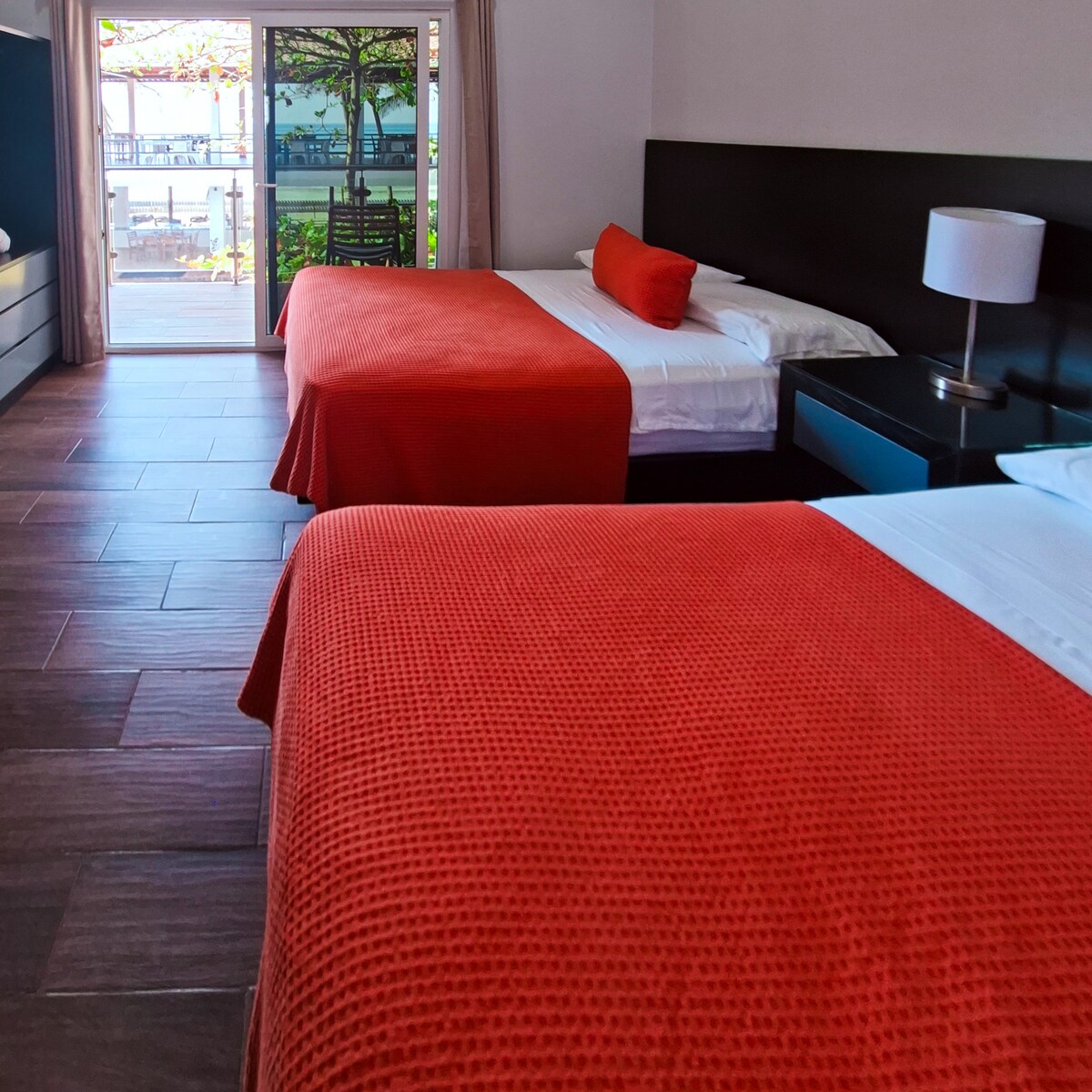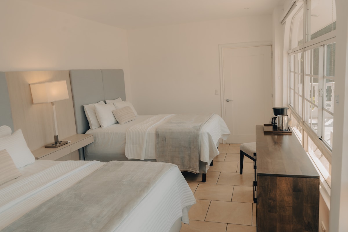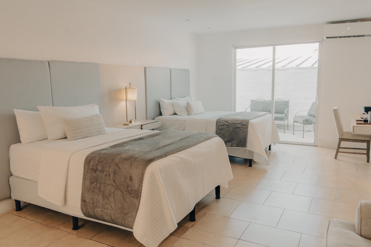 CASA 135 – Habitación #6 | Doble Queen con Vista Panorámica Habitación amplia, moderna y cómoda con dos camas queen size, ideal para parejas, amigos o familias pequeñas. Su diseño limpio y acogedor es perfecto para descansar después de un día en la ciudad. Disfruta de una vista panorámica de San Salvador desde la habitación, especialmente hermosa al amanecer y al atardecer. Ubicada en CASA 135, un hotel boutique tranquilo, elegante y cerca de todo.