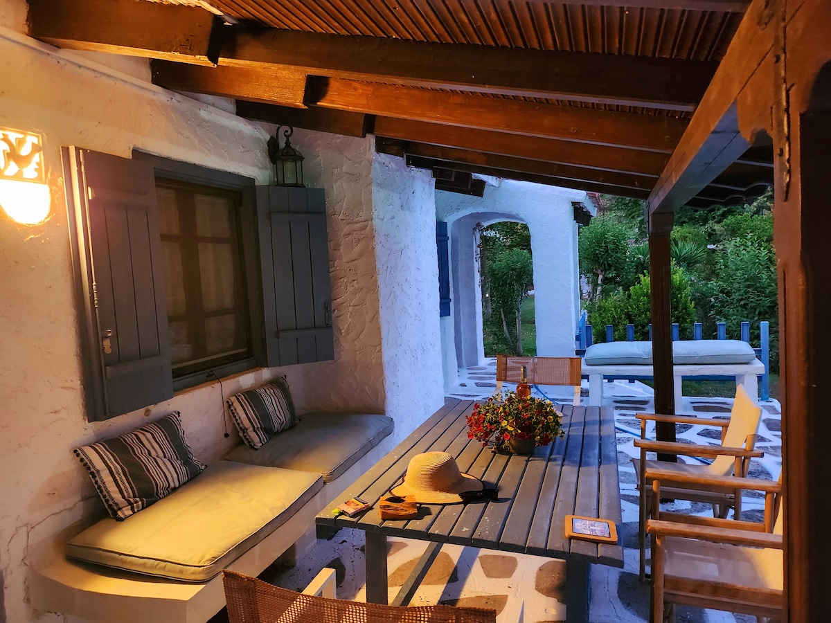 Sani is a bustling seaside village known for its summer art festival, with folk and pop music concerts around a nearby hill, topped by the 16th century Stavronikita Tower. . On the neighboring coast there are several beach resorts, while a short path through the pines leads to a quieter area of sand and shallow water.the house is traditional and located in the forest distance from the beach 700 meters is a place to relax and enjoy nature
