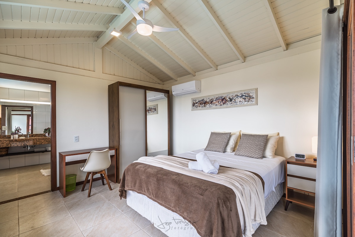 A private Loft whit a breathtaking view of ¨Lagoa da Conceição¨ and the Sea,ideal for couples,located in the ¨Canto dos Araças¨neighborhood,in the middle of Atlantic Forest.A cozy location,both silent and private,only 2 Kilometers from the center of Lagoa neighborhood,300mts from Lagoa da Conceição,at the beginning of the trail to Costa da Lagoa.A panoramic,romantic house ideal for couples.5 minutes by car to the Center of Lagoon.10/15 minutes by car to the beach Mole/Joaquina/Galheta/Barra.