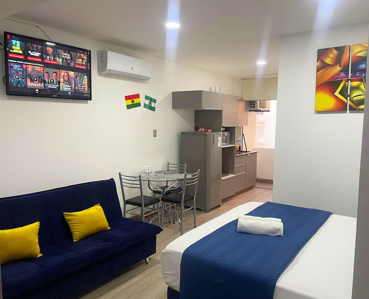 Equipetrol :豪华单间公寓,超大双人床和餐厅
