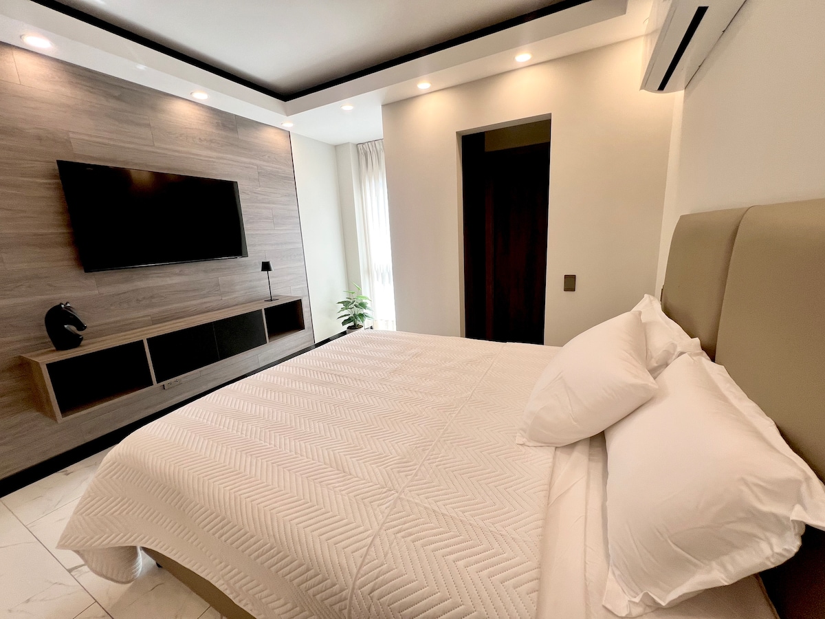 Luminoso y amplio departamento de 2 dormitorios, ideal para familias, vacaciones o viajes de trabajo. Disfruta de cocina equipada, balcón con vista espectacular, wifi rápido, Smart TV, lavadora, secadora y parqueo privado. Sábanas y toallas de lavandería profesional para tu total comodidad. Relájate en las áreas sociales con piscina temperada, piscina exterior y sala de juegos para niños. Una opción perfecta para estancias cortas o largas, con todo lo necesario para sentirte como en casa.