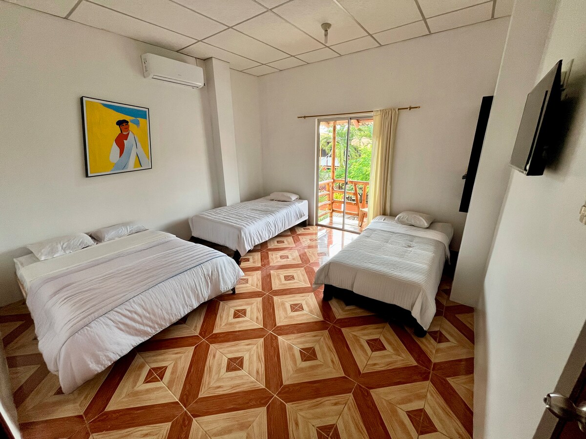 Habitación en planta baja con una cama matrimonial y dos literas de 1.5 plazas, ideal para grupos o familias de hasta 6 personas. Tiene aire acondicionado, baño privado funcional, Smart TV con Netflix, estante tipo armario y colgador de ropa. Cómoda y bien ventilada. Acceso libre a piscina, cocina, parrilla, jardines, hamacas y más. A solo 7 minutos de la playa y del centro de Montañita, pero alejado del ruido. Tranquilidad y espacio para compartir.