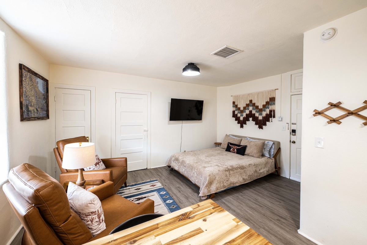 Welcome to our one bedroom modern Southwest suite in the heart of Santa Fe! Experience the perfect blend of contemporary and traditional Southwestern charm in our luxury suite. Our suite is ideally located just blocks away from Santa Fe's historic Plaza, where you can start the day on your porch rocking chairs, then dine at world-class restaurants and experience the vibrant local culture. *Enjoy Spring in Santa Fe and parking for large vehicles.