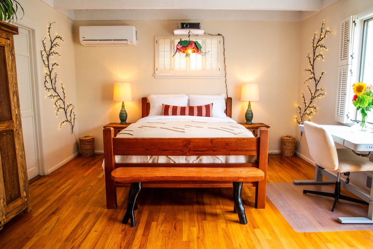 Welcome to Santa Fe! This charming studio cottage and my home share the property in this quiet residential neighborhood. The cottage is full of Santa Fe charm with a cozy, pretty interior, skylights and lots of natural light, a fully-stocked kitchen corner, handmade cabinets, Mexican tile, one comfy queen-sized bed, and a private garden patio. It's a quiet haven but centrally located, just 2 miles from the Plaza/downtown. It's a lovely place for couples, solo adventurers, and business travelers.
