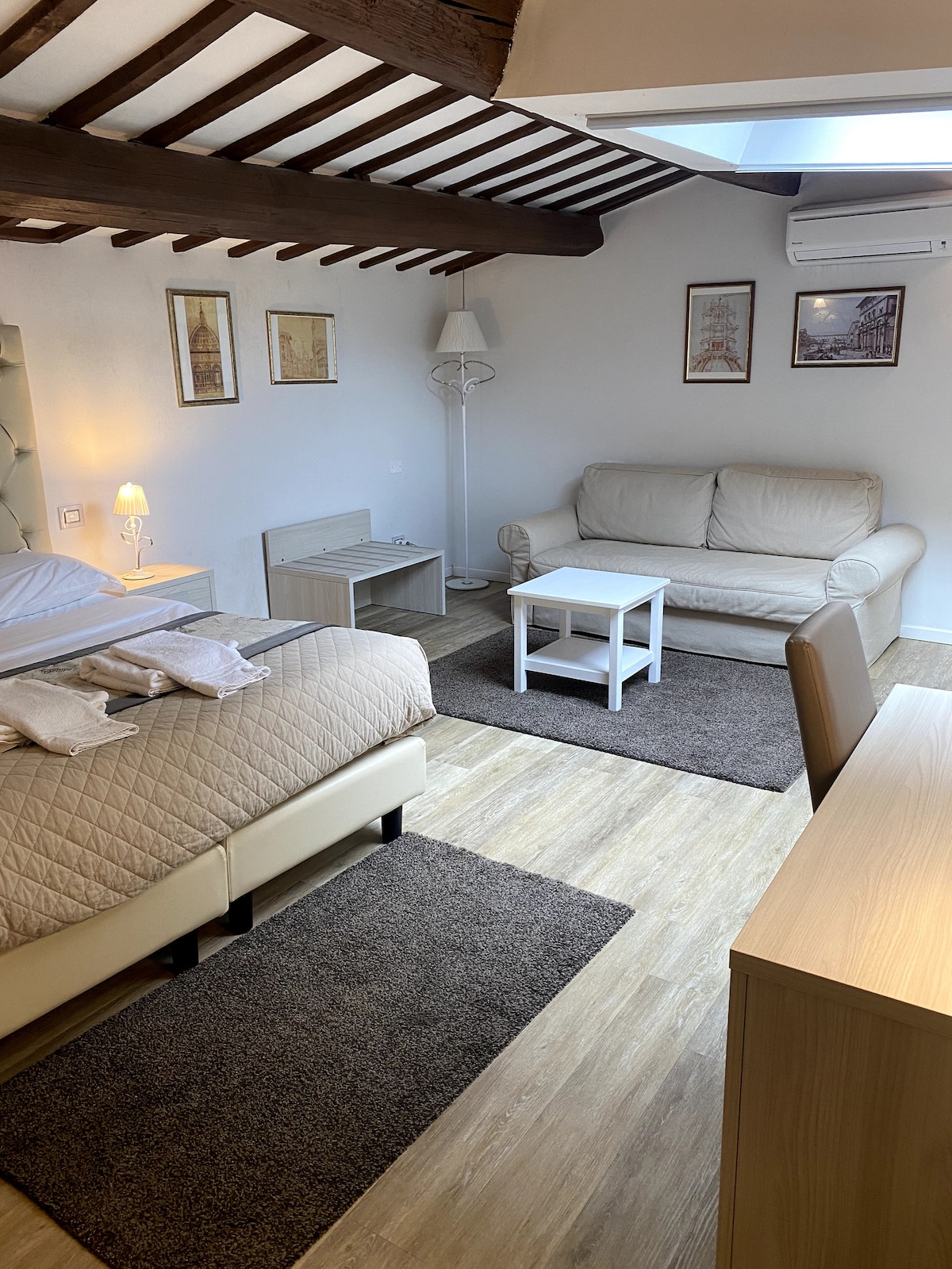 Double bed + sofa bed with kitchenette and private bath. The guest house is at easy walking distance from SMN train station and old town. Well connected by public transportation, tram stop right in front of the building. Access by car is possible since the place is not in the limited traffic zone. Garage Porta al Prato-Leopolda right next door. The room is equipped with AC, wi-fi, smart tv, kettle and fridge. The private bathroom is located in the corridor outside the room. Twin beds on request.