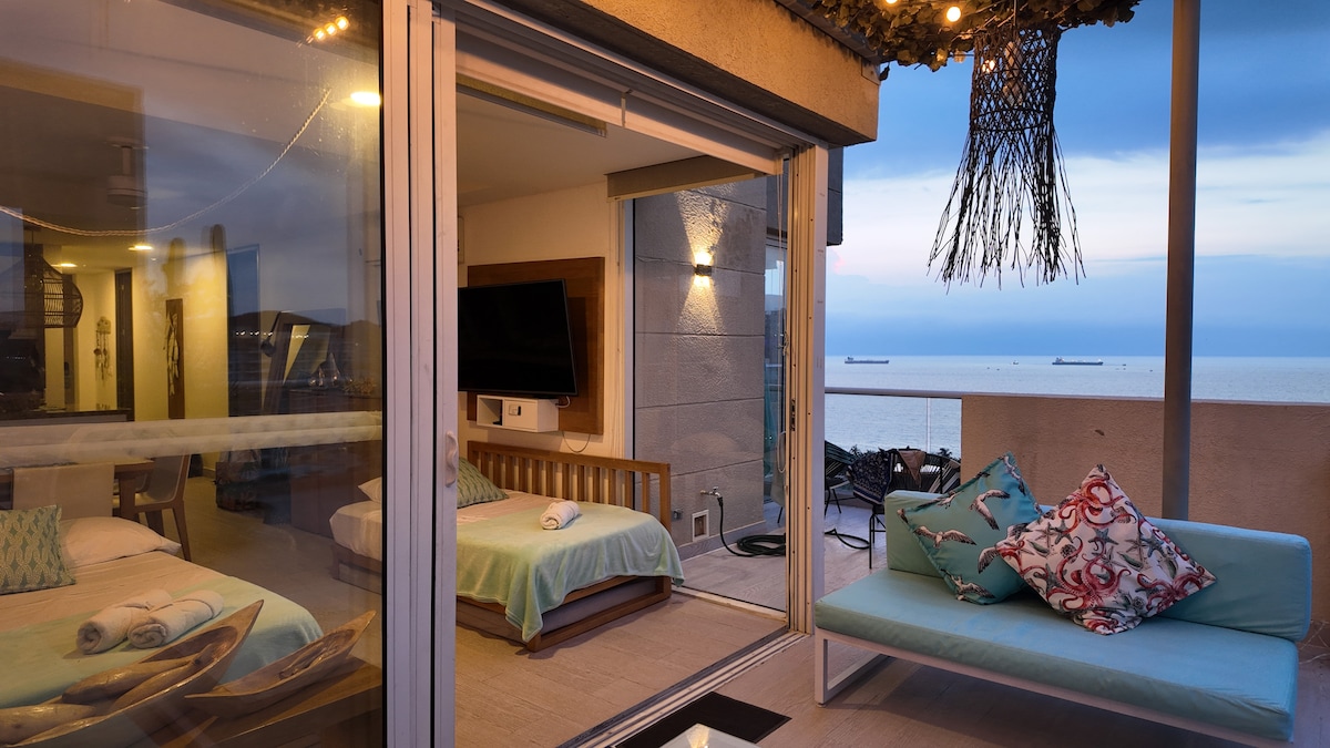 Cierre del Parque Tayrona entre el 1 y el 15 de febrero 2026. Espectacular vista a la bahía, diseño elegante y cómodo, perfecto para disfrutar de días de descanso en pareja o temporadas largas de trabajo. Cocina completa con vista a la bahía. Amplia terraza privada, aircon, wifi, fibra óptica, televisor conectado a internet. Área social con amplia piscina compartida, vista a la bahía, barbacoa y sitio de descanso. Loft no apto para niños, ni personas con limitaciones para caminar.
