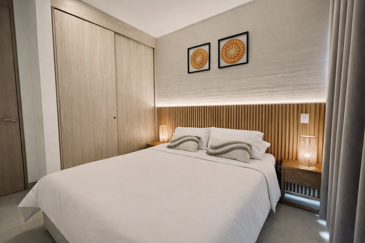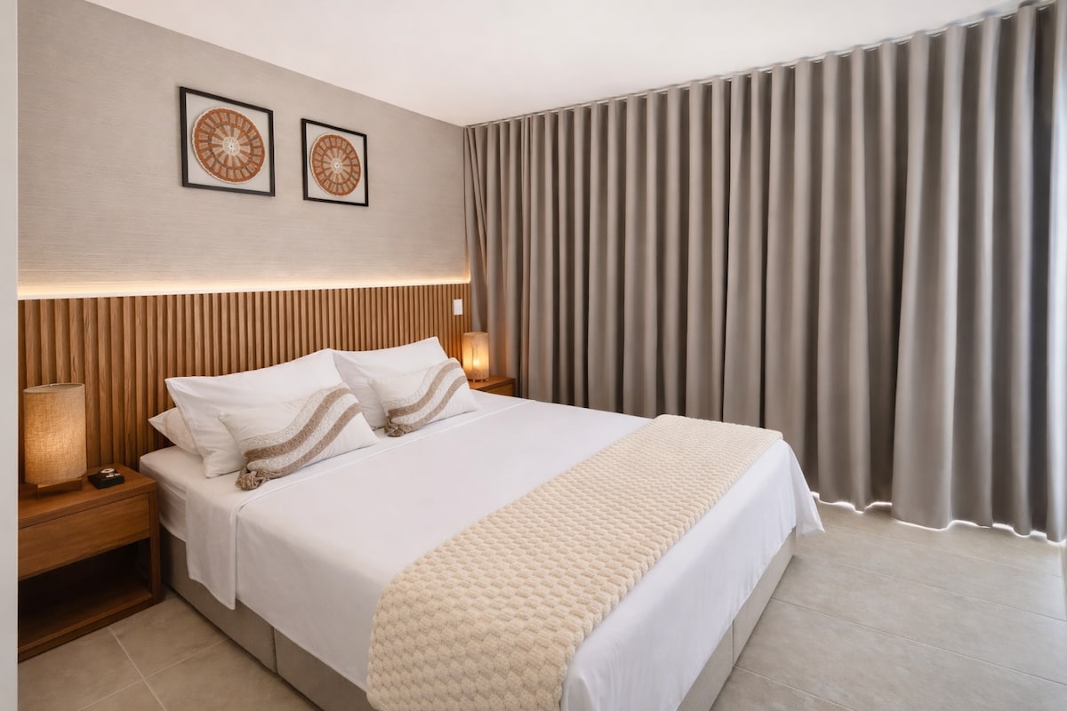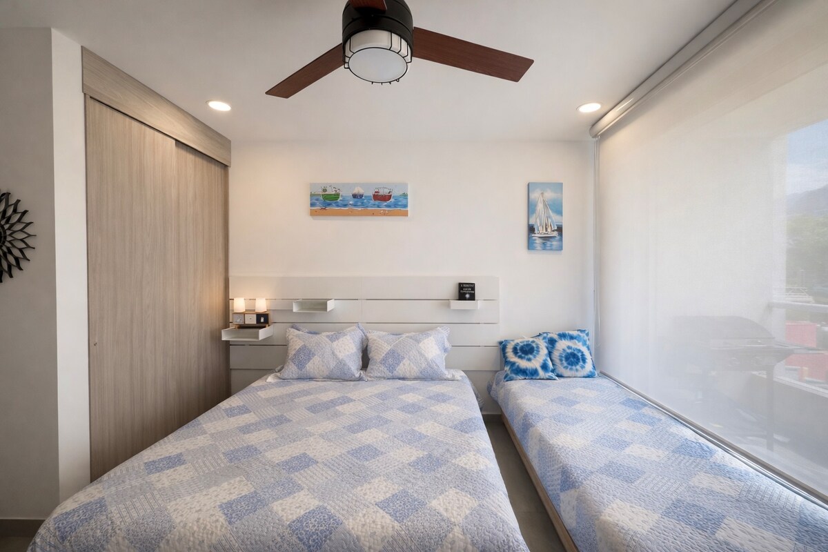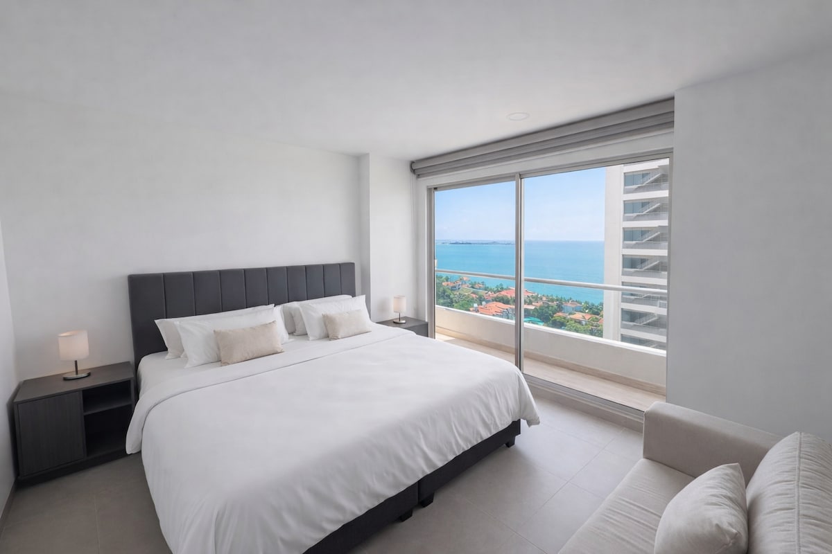 Despierta con vista a la ciudad y al mar desde el balcón en esta apartasuite ideal para 3 personas. Un espacio moderno y cómodo para descansar, vacacionar o trabajar remoto, con wifi de fibra óptica, Smart TV y cocina totalmente equipada. Vive una experiencia tipo resort con piscinas, jacuzzi panorámico, spa, gimnasio, coworking, BBQ y restaurante en la terraza. Ubicada en Rodadero Sur, a pasos de la playa y rodeada de excelentes restaurantes.