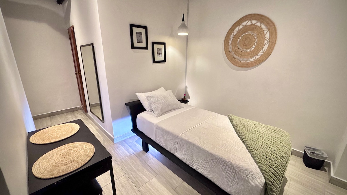 Habitación pequeña para pareja, con baño privado, aire acondicionado y hermosa vista hacia el mar. tendrás acceso a toda nuestra zona social. Perfecto espacio para disfrutar de unas vacaciones con tu pareja contagiándote de la buena energía de casa Babel, un lugar de hermosos atardeceres. Couple room with private bathroom, AC and a fantastic view to the sea. You can enjoy about all our common areas in the hotel. (Pool, big hammock, bar, relaxing living room and rooftop)