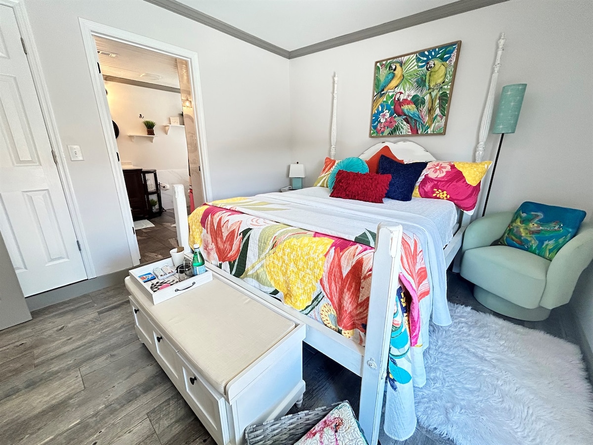 Perfect romantic getaway with king size bed, large jacuzzi tub, and walk in double headed shower. Located just minutes from the airport, downtown and the beach! Walking distance to some of Pensacola’s most unique dining establishments. Private entrance with keyless access. We’ll provide everything you need for a day at the beach - chairs, umbrella, beach towels and cooler. Large screen tv and high speed internet. The suite does NOT have a kitchen. NO SMOKING!