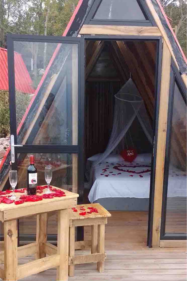 Hospedaje tipo glamping con desayuno incluido en la capital mundial del balón (Monguí, Boyacá). Ambiente interior totalmente en madera con caletafactor eléctrico y minibar, rodeado en un entorno natural y cercano a lugares turísticos como el paramo de Ocetá, el puente calicanto y la cascada de la cagrada familia. En Monguí puedes conocer cómo se elabora un balón visitando una fábrica de balones para todos los deportes. Valor adicional por mascota 25.000