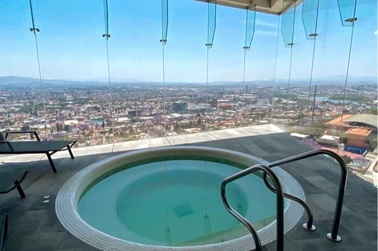 Luxury apartment on the 11th floor of a completely new exclusive tower. All the amenities including AirCon, the best place in Querétaro, 5 minutes from excellent restaurants, ITESM, Paseo Querétaro, the Campanario, the Center of Querétaro. Covered pool, Jacuzzi, Gym, enjoy the best view from one of the highest points in Querétaro. The access is private and it has 24-hour security, covered parking for 2 cars.
