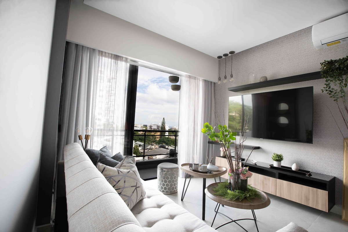 在Piantini欣赏城市天际线、山脉和海洋美景