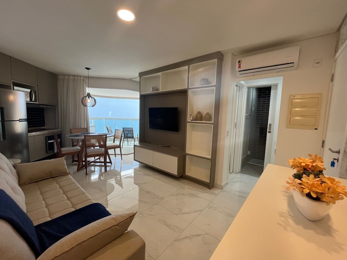 Super Host Brasil oferece privilegiado, com sacada maravilhosa vista mar (telado) e localização "pé na areia". Serviço de arrumação, barraca de praia aos fds, WIFI de alta velocidade, ar condicionado na sala e no quarto, cozinha com cooktop 2 bocas e frigobar. Smart TV na sala e no quarto. Piscina e academia com vistas panorâmicas, no condomínio. Temos uma vaga de estacionamento gratuita. Hóspedes devem levar toalhas, roupa de cama e itens de uso pessoal.