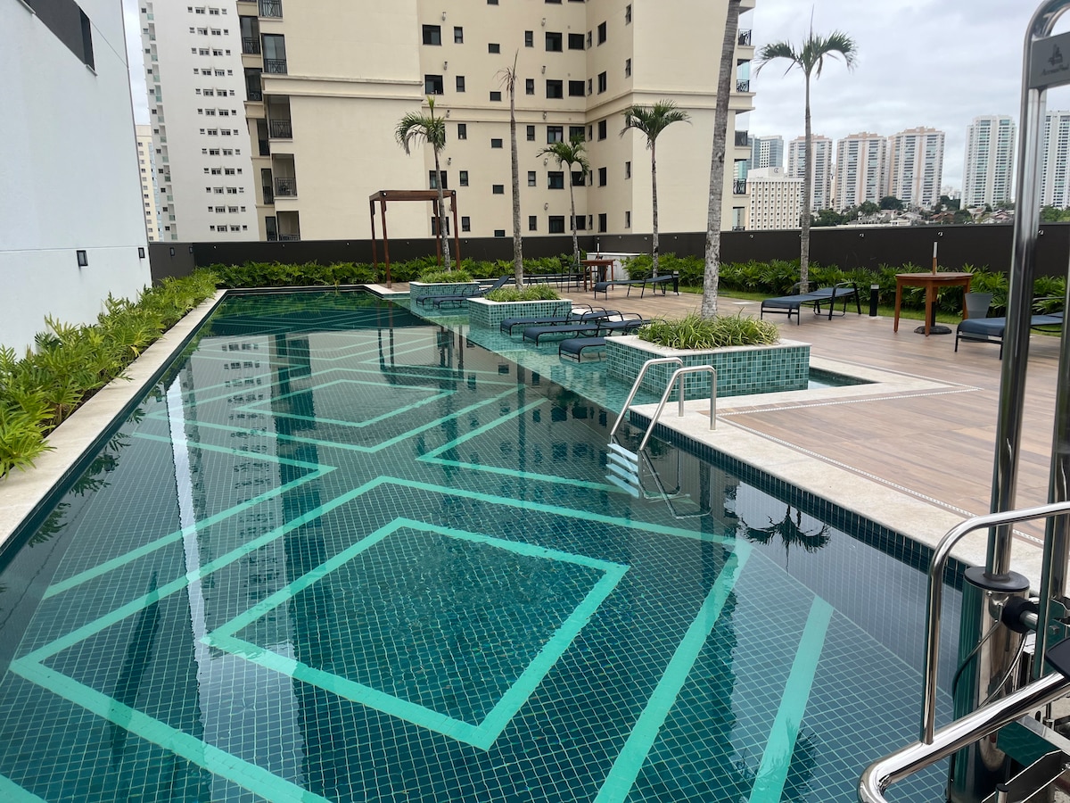 O Flat localiza-se no Summit Flat Service com recepção bilingue 24hrs, estacionamento gratuito, piscina, academia e limpeza diária. Recém reformado com decoração clean e aconchegante possui uma mini cozinha completa com frigobar, cooktop, microondas, cafeteira elétrica, e todos utensílios de cozinha. Próximo ao shopping Center Vale (2 quadras) O prédio possui uma mini conveniência para necessidades básicas. INCLUÍDO ROUPA DE CAMA E BANHO.