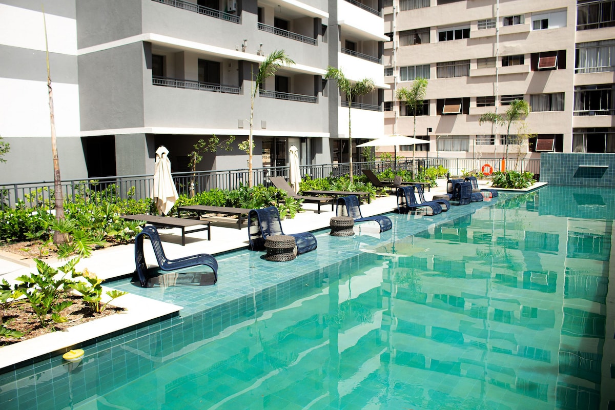 Apartamento com um quarto com cama queen, e sala com sofá cama para 1 adulto e uma criança, mesa e cadeira e TV Samsung 55", cozinha americana com frigobar, micro ondas, fogão, forno elétrico, cafeteira Keurig, panelas, formas metálicas e utensílios de cozinha. Para sua comodidade e conforto Lavadora e secadora de roupas LG. Secador de cabelo e prancha Revlon. Na cobertura piscina, sauna seca, ducha e lounge com mesa de bilhar. Estacionamento com manobrista. Serviço de Hotelaria diariamente.