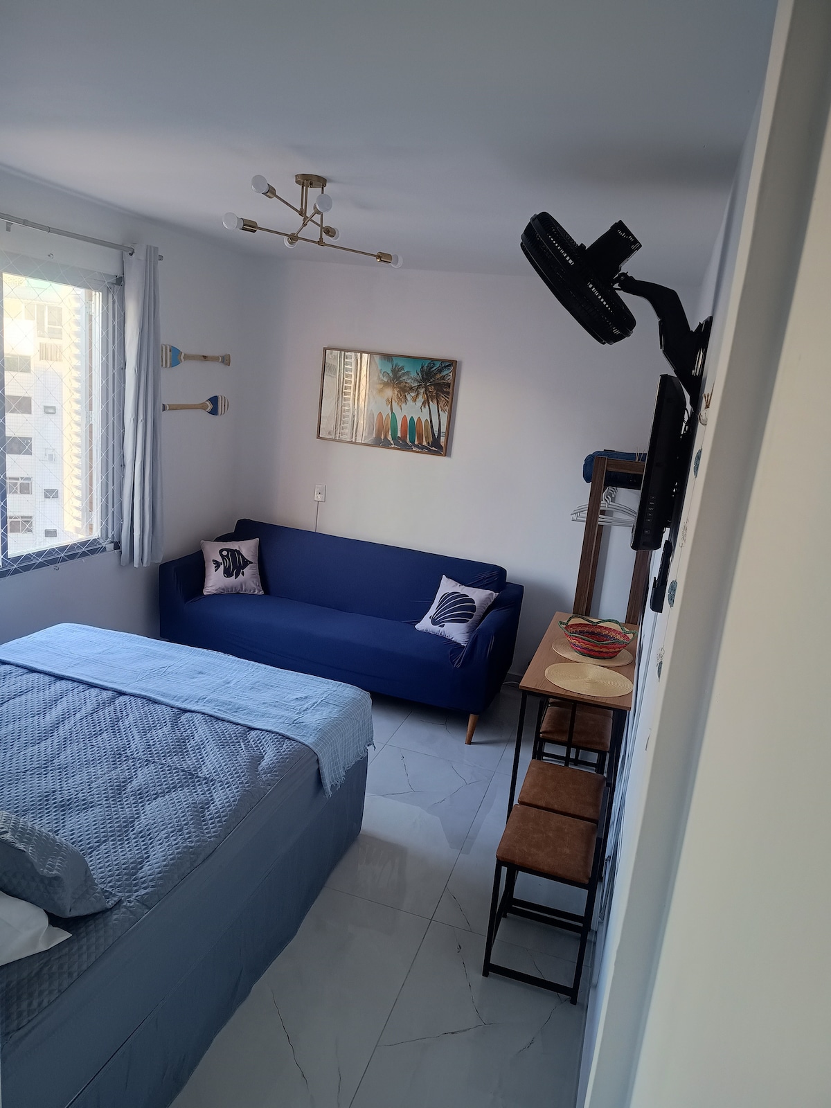 Apartamento tipo sala living, bem iluminado e arejado, com varanda espaçosa e vista para o mar, localizado no 5º andar de um prédio em frente à Praia do Gonzaguinha em São Vicente. O prédio é de frente para o mar entretanto o apartamento é lateral proporcionando noites tranquilas. Possui portaria 24h e 1 vaga de garagem garantida. Nas acomodações dispomos de ar condicionado split, quarto com cama de casal separado por porta de correr e um closet. Fornecemos roupa de cama e toalha de rosto.