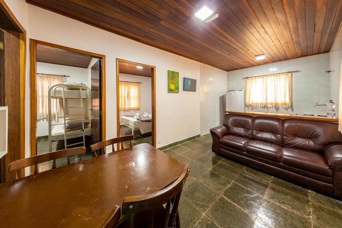 Chalé rústico e acolhedor em madeira e tijolo à vista, perfeito para quem busca descanso, natureza e simplicidade com charme. O espaço conta com sala com sofá, cozinha ampla equipada, quarto espaçoso com cama de casal e varanda coberta. Móveis em madeira de demolição e iluminação suave criam um clima aconchegante. O banheiro é compartilhado e fica fora do chalé, em área comum, sempre limpo e bem cuidado. Ideal para casais e viajantes tranquilos.