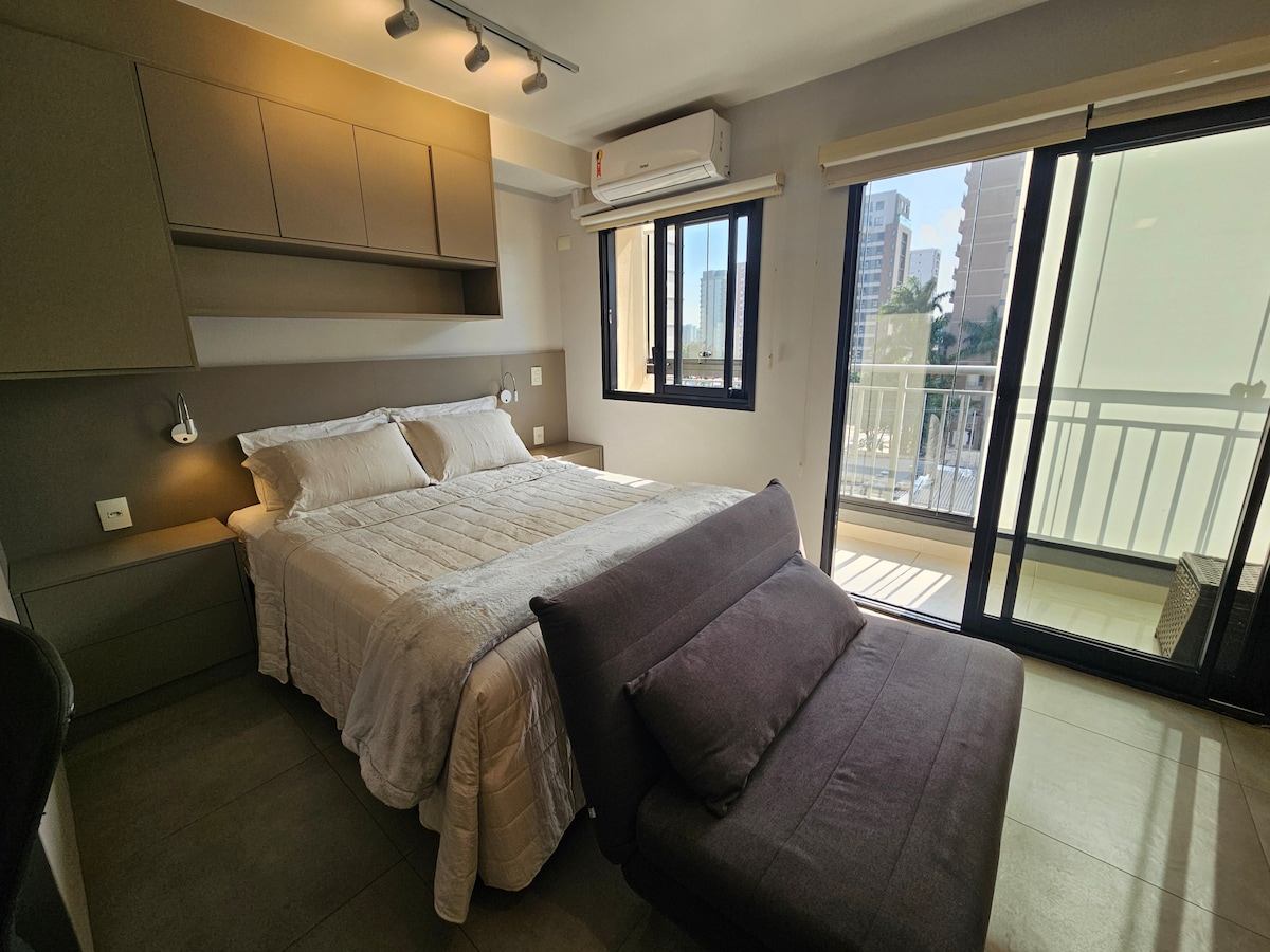 Estúdio Novo com Vista Panorâmica — 24º Andar com Piscina Infinita e Estilo! Desfrute de São Paulo com conforto e estilo em nosso estúdio montado com carinho para recebê-lo. Localizado no 24º andar com *vista envidraçada de 180° para a Marginal Pinheiros*. Um refúgio moderno, ideal para quem busca praticidade, comodidade e uma experiência diferenciada na cidade.
