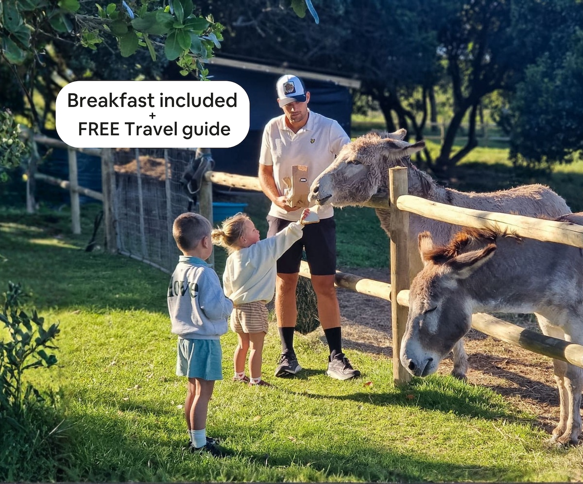 Experience the perfect blend of nature and comfort with your own swimming pool at our small family farm. You'll be surrounded by wild peacocks, free-range chickens and donkeys. Plus: - FREE 28-Page Garden Route Travel Guide - When you book with us, you’ll receive our exclusive Travel Guide full of hidden gems, activities, national parks, and extra safety and travel tips for your journey. - Homemade Breakfast Incl. - 2min Drive to 1# ranked Beach in Town - 1min Drive to Golf Club with Zebra's