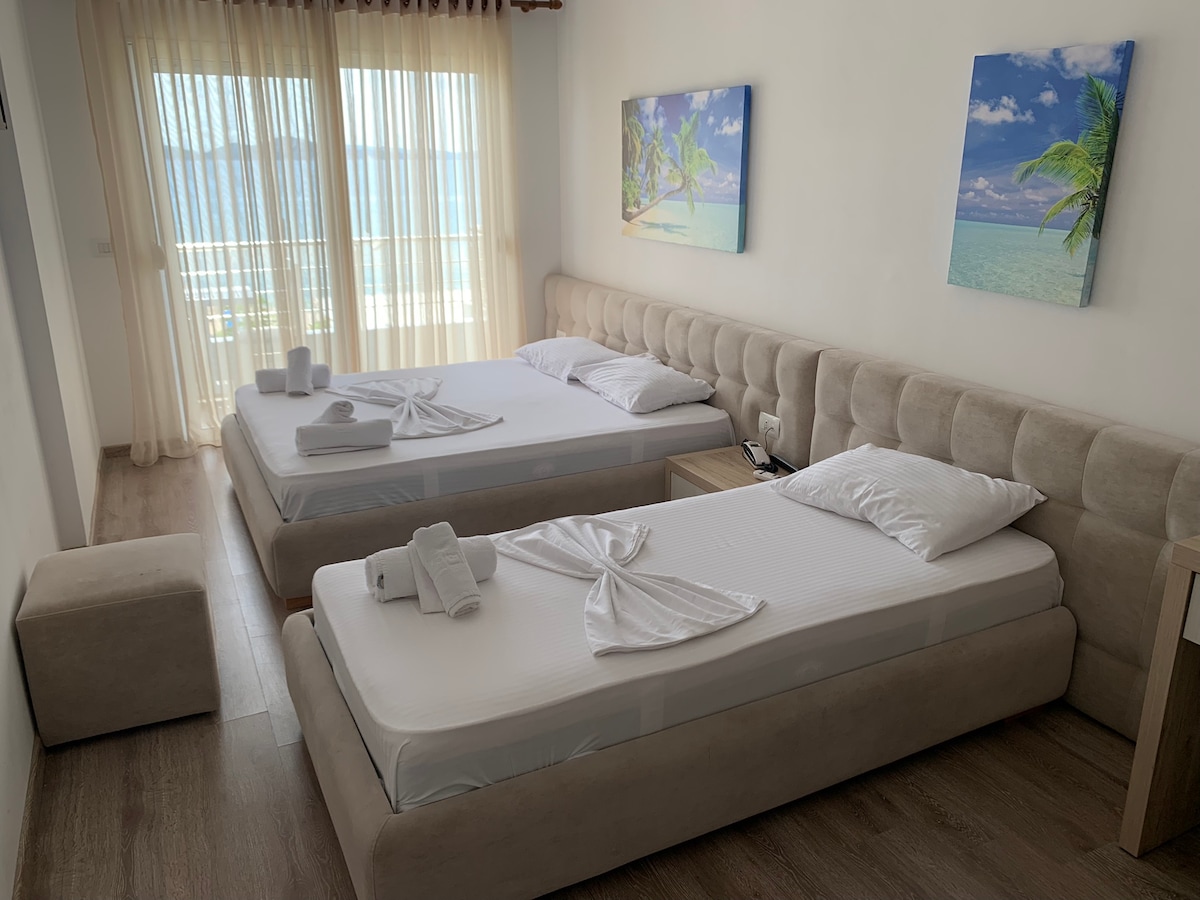 SpaciousTriple Room ,with amazing conditions .In our place you will find friendly environment and delicious food accompained by free private beach and sunbeds for you and your family We offer free Breakfast at our wonderful restaurant and everything else that will accomplish all your needs for unforgetable holidays . For any question or more please follow us on Instagram; Zero Zero Apartments