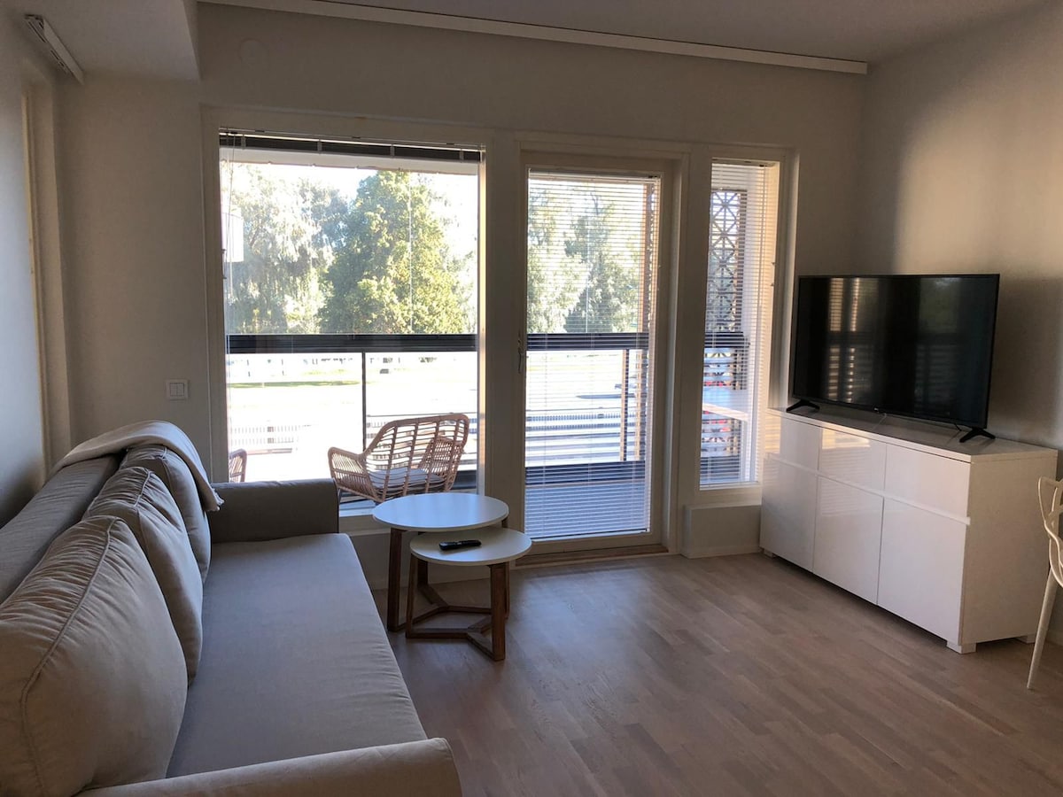 Hyvällä maulla sisustettu valoisa uusi kaksio aivan kauppakeskus Puuvillan vieressä. Asunnon sijainti on hyvin keskeinen mutta kuitenkin ilman liikenteen melua. Keskustaan n.1km, Kirjurinluotoon 900m. Huoneistossa on kaikki tarvittavat kodinkoneet sekä kuivaava pyykinpesukone. Parivuode ja kahden hengen vuodesohva. Tarvittaessa käyttöön saa lisäksi varavuoteen yhdelle. Huoneistossa 55 tuumainen TV, radio ja Wifi/valokuitu. Viihtyisä patio pihakalusteineen ja autopaikka pihassa.