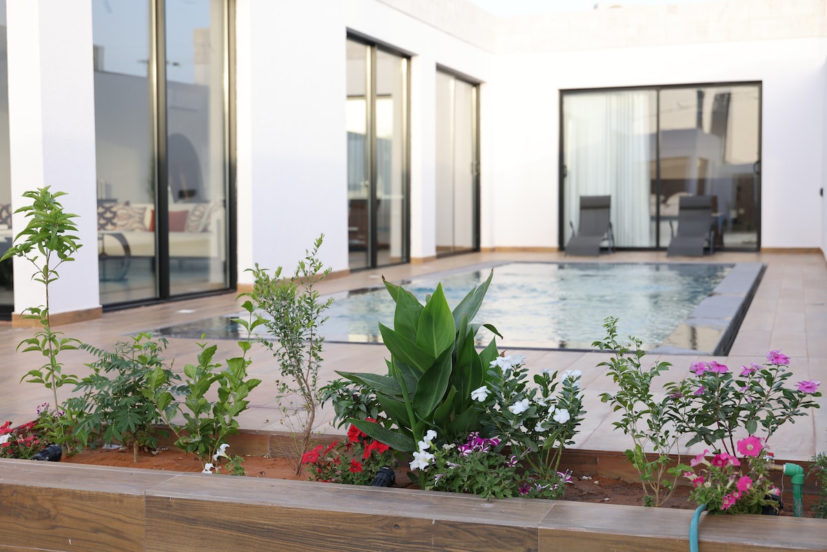 فلة مودرن ثلاثة ادوار بمدخل خاص للسيارة و( دخول ذكي ) وحديقة خارجية مع جلسة و مسبح خاص بالفله بالاضافة الى عامل للفله وغرفة خادمة+ صالة 8*7 بشاشة 85 بوصه سامسونج سنمائية مطلة ع الحديقة والمسبح+انترنت 4G 5G بالاضافة الى شتر لحجب ضوء الشمس+كورنر كوفي مع كامل اجهزته+مطبخ متكامل ( جميع ما تحتاجه للاستمتاع والاستجمام ) A modern villa, three floors, with a private entrance to the car, an outdoor seating with a sitting and a private pool for the villa ( everything you need for fun and relaxation )