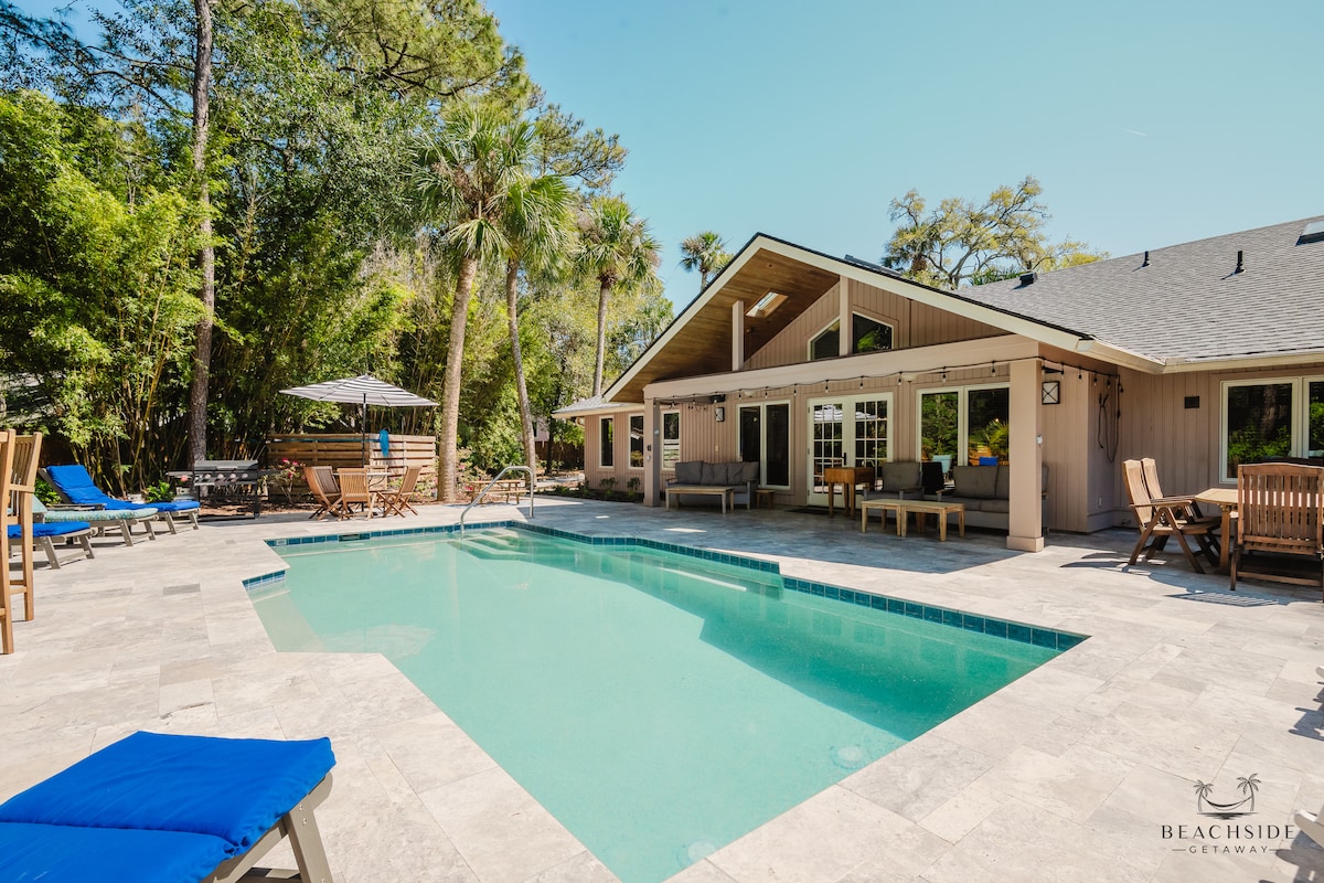 Step into paradise at this luxurious 6BR, 5BA beach house just 30 steps from Hilton Head’s quietest and most beautiful beach! Modern meets coastal charm in this beautifully renovated home, featuring a resort-style backyard with a pool, hot tub, and pergola with an outdoor TV. Sleeps 16 & dog friendly! Perfect for large families or groups. Enjoy unbeatable beach access and stylish comfort in the charming Folly Field neighborhood just minutes from world-class dining, golf, and island adventures.