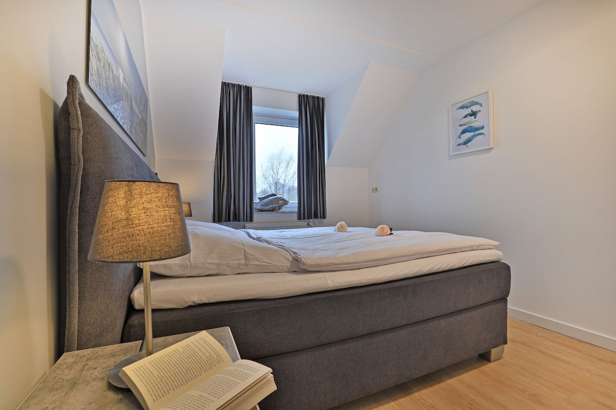 Welcome to my apartment, GreyPearl. This freshly renovated, high-quality 45m² apartment offers everything you need for a relaxing and active stay in Büsum: → King-size bed → Smart TV & Netflix in both the living room and bedroom → Nespresso coffee machine → Modern kitchen → Terrace with seating → Walking distance to the town center and only 300m from the Perlebucht lagoon → Bed linen and towels included → Parking space available