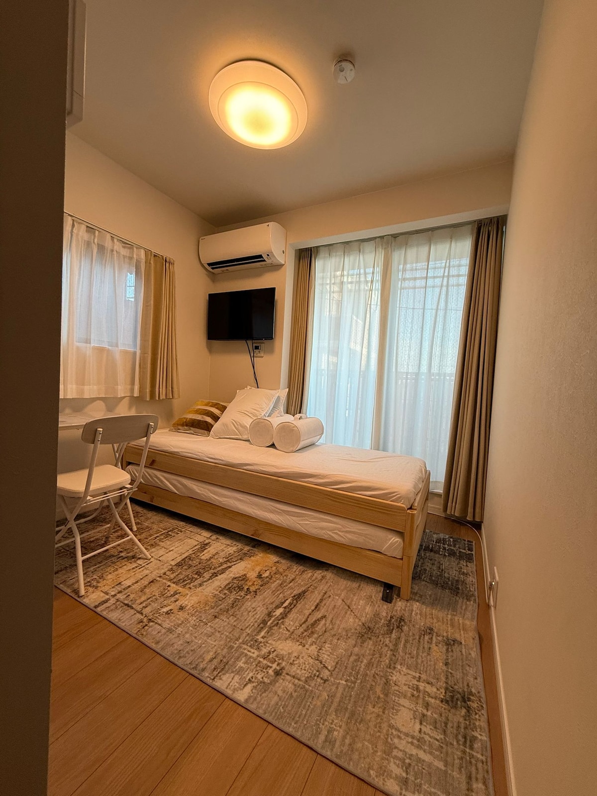 デザイナーによって丁寧にリノベーションされたお部屋です。 京王線「布田」駅から徒歩約10分、「調布」駅から徒歩約15分。新宿駅へは電車で最短18分とアクセスも良好です。 近隣にはコンビニ(徒歩3分)やスーパー、飲食店があり、生活環境が整っています。 また、都内からの空港アクセスも便利で、 羽田空港へは電車で約1時間、成田空港へは約1時間30分で到着します。 さらに調布市内には調布飛行場があり、伊豆大島・新島・神津島などへの定期便が発着しています。 お部屋はプロのクリーニング済みで、とても清潔に保たれています。 最大6名様までご宿泊いただけます(クイーンベッド1台、ソファベッド1台、シングル敷布団2組)。 基本的な生活用品・アメニティを完備しており、長期滞在にも快適です。 室内では無料Wi-Fiをご利用いただけます。 また、ヘアアイロンも備えております。 ※調味料のご用意はございません。 ※撮影でのご利用の場合は、別途費用を頂戴いたします。 【設備】 ベッド:クイーンベッド×1(160×200cm) 敷布団:シングル×2 ソファ:1 ソファベッド:1 テーブル:1 椅子:4