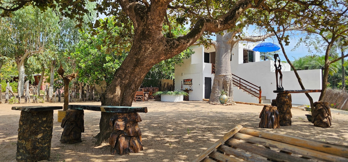Palmarin, village authentique au cœur du Sine Saloum. La maison se situe à quelques centaines de mètres du village dans un jardin arboré de 3500 m2, au bord de l'océan et à la limite de la réserve naturelle communautaire. La chambre est située face à l océan , au bout du jardin. Chambre avec salle d'eau (douche eau chaude, lavabo, wc). lit 2 personnes avec moustiquaire, armoire, bureau. ventilateur. Possibilité d' un lit supplementaire d'1 personne . La piscine pour vous rafraîchir!