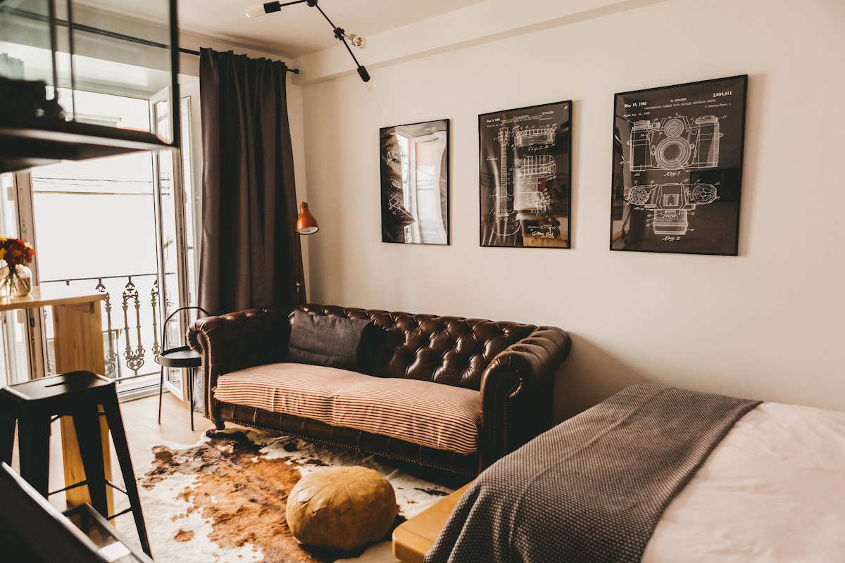 加大双人床,带阳台。时尚的远程工作公寓