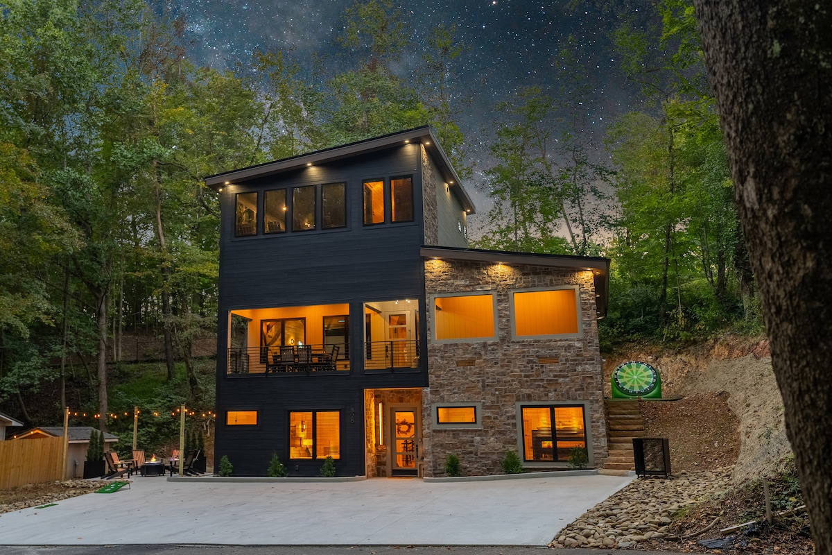 The perfect getaway. Breathtaking. This stunning upscale property offers breathtaking and expansive views of Great Smoky Mountains National Park from home. With a modern cabin design, this house and property features a hot tub, Gas BBQ, games room, two livings rooms, and an Airbnb rarity: private ensuite bathrooms for each bedroom. Your private mountain escape! Accessible and peaceful, only 15 mins to grocery and restaurants. Stay here & create memories to last a lifetime!
