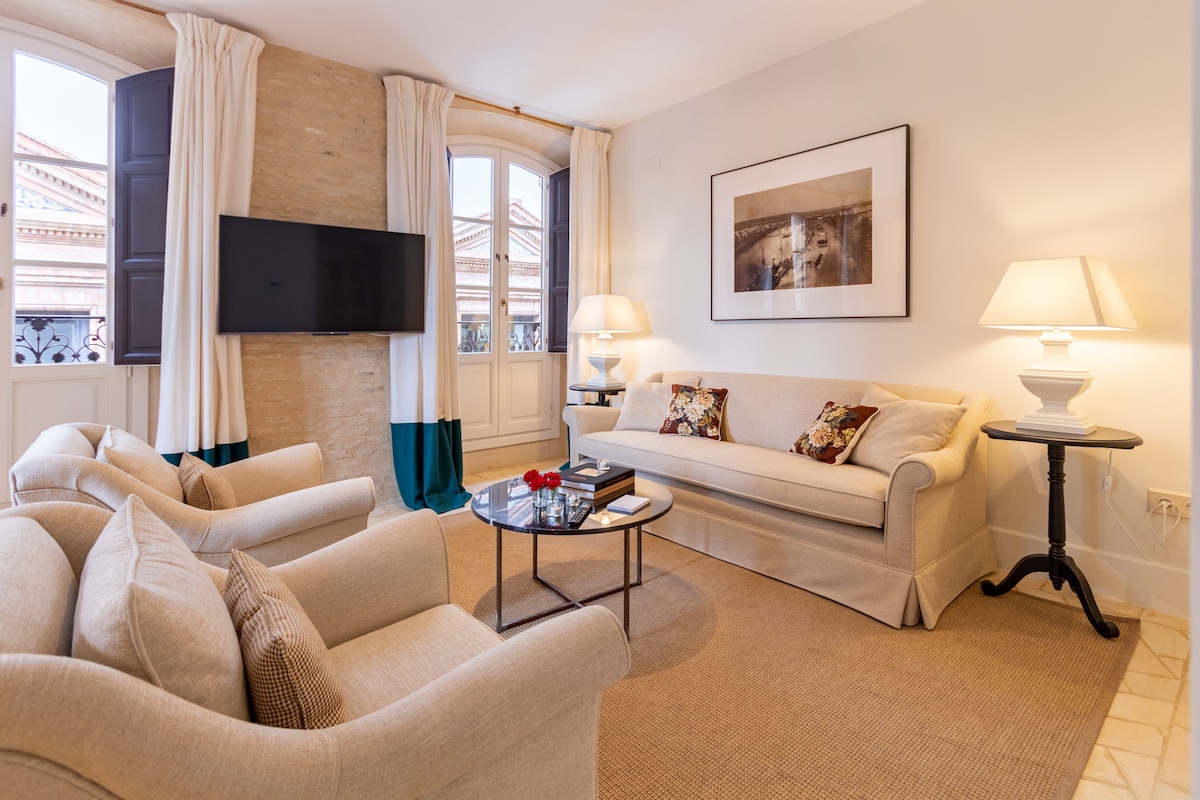 The most exclusive penthouse in Seville, located facing three UNESCO World Heritage monuments: the Cathedral, the Archive of the Indies, and the Alcázar, on Avenida de la Constitución, main artery of the old town. It has two spacious bedrooms, each with a terrace and views of the monuments, two full bathrooms, and a large living room with a terrace and four big windows offering amazing panoramic views. The kitchen-dining area is integrated into the living room. Free parking is included.
