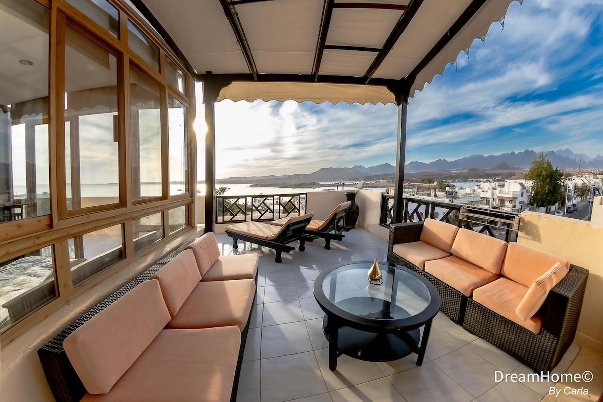This unique place has a style all its own. The views are impeccable and nothing to compare with all over the Sharm cliff Hadaba neighborhood. It is fully equipped with a built in kitchen with all new appliances, to make your stay as comfortable as possible. A lot of shopping, cafes and restaurants around, with the infamous “Farsha” 15mins walk. Another group of beautiful sandy beaches are within the same distance.