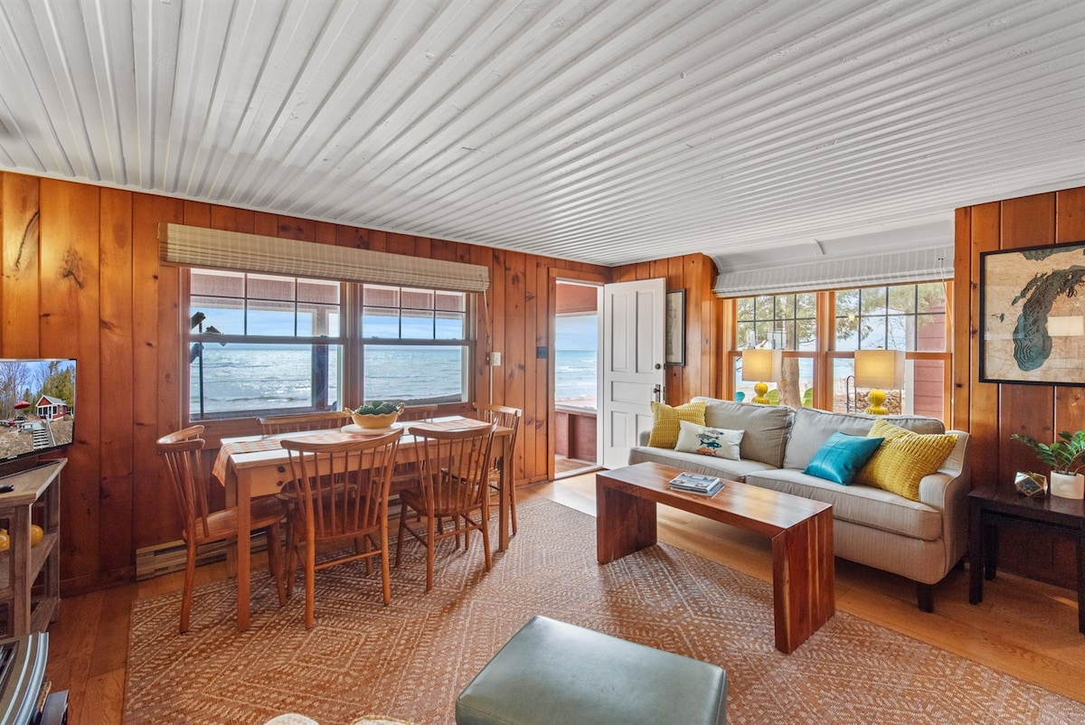 This 2600 sqft lakefront home is a spacious retreat year round, friendly to kids and dogs. It is perched upon a bluff overlooking Lake Michigan with a gorgeous sunrise view. In winter, enjoy passing cargo ships and eagles along with ice formations. Inside, dine with seating and service for 12 after cooking in the spacious kitchen with wood fireplace. Kitchen, living room, dining room and 2 bedrooms have full lake view. 2 large screen tvs. Spa quality bath with whirlpool. Gas fireplace too!